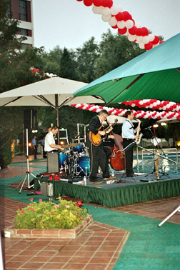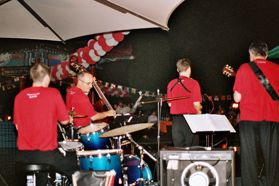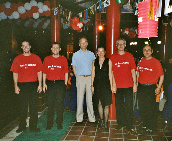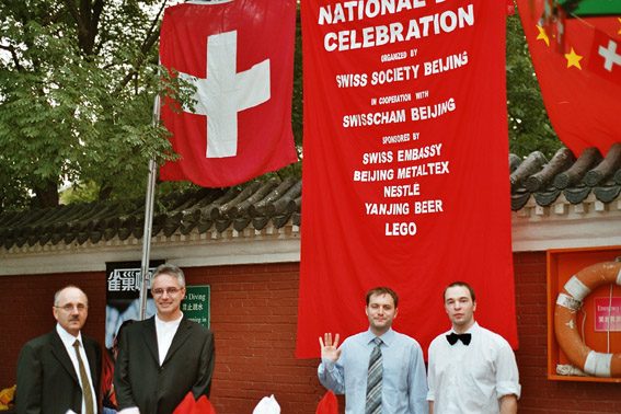 Wir proben am Vormittag und am frühen Nachmittag; danach ist Relaxen im Swimmingpool und Fitnessprogramm angesagt. Schliesslich richten wir Verstärker und Instrumente für den Festanlass am Abend ein: Erstaugustfeier, organisiert vom Schweizer-Club Beijing und vom Sino-Swiss Hotel, verbunden mit der Eröffnung des Swiss Peaks-Festivals, das unter der Federführung von Kulturattaché Schifferle steht. Es wird ein toller Abend: ideales Wetter (für einmal nicht allzu heiss und feucht), zahlreiches, erwartungsfrohes Publikum, aufwändige Dekoration, leckeres Essen (inkl. Bernerplatte, Raclette, Bratwurst, Waadtländer Weisswein), sich im Pool tummelnde Kinder. Nach diversen Reden - auch Bundespräsident Joseph Deiss richtet sich ab Band an alle AuslandschweizerInnen - und der Nationalhymne werden wir dem Publikum einzeln vorgestellt und spielen dann ein ganz schön heisses Set à ca. 40 Minuten. Danach empfängt uns der Schweizer Botschafter in China an seinem Tisch zu einem Gespräch. Er zeigt sich sehr angetan von unserer Darbietung, drückt seine Wertschätzung für unser Projekt aus, das Pioniercharakter hat, weil es Schweizer Kultur in einen Bezirk Chinas gebracht hat, wo die wenigsten Leute überhaupt von der Existenz unseres Landes gewusst haben dürften. Nach einem zweiten Set mit eher leichter Jazzmusik greifen auch wir zu Speis und Trank, und der Abend klingt in Minne aus.